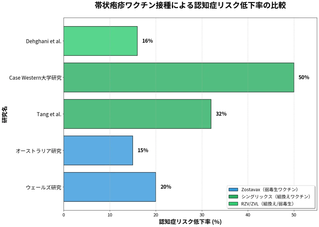 上のグラフは、主要な5つの研究における認知症リスク低下率を比較したものです。青色のバーは従来のZostavaxワクチン、緑色のバーは最新のシングリックス(組換えワクチン)の結果を示しています。Case Western大学の研究では50%という最も高いリスク低下率が示されており、シングリックスが概して高い効果を示していることが視覚的に理解できます。
