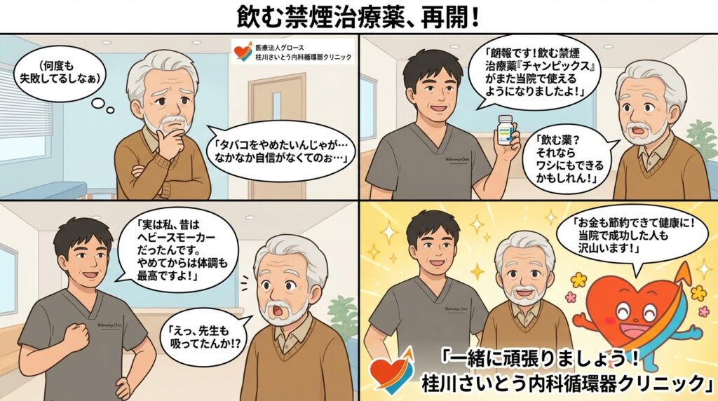 チャンピックスは科学的根拠に基づく効果的な禁煙治療薬として、多くの方の禁煙成功をサポートしてきました。治療の再開により、再び選択肢として利用できるようになっています。禁煙は健康改善への第一歩です。一人で頑張る必要はありません、医療専門家のサポートを受けながら、確実で安全な禁煙を目指しましょう。