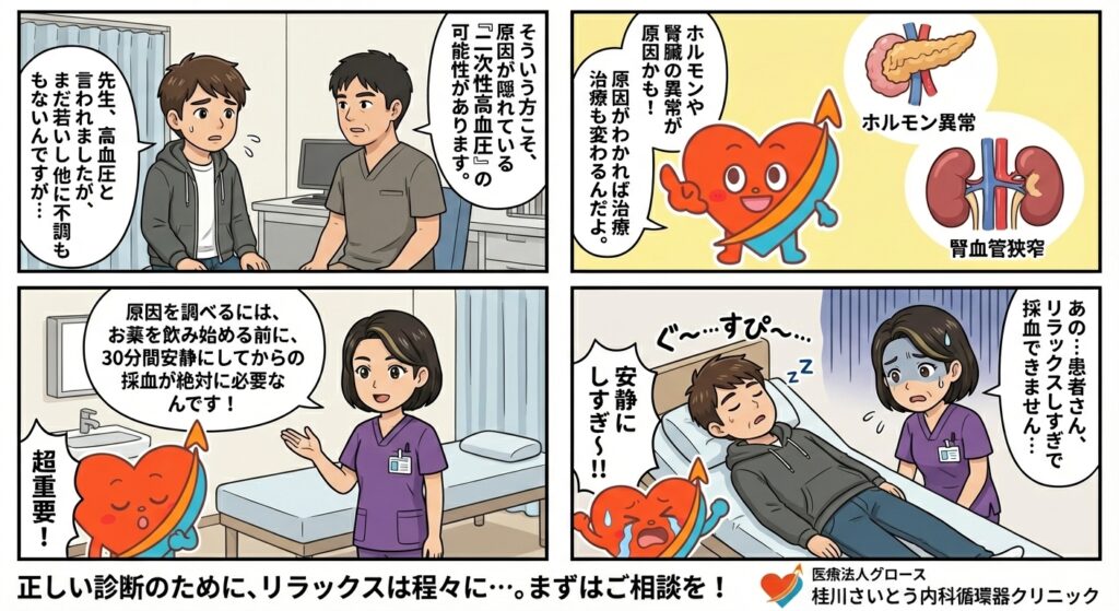 ここが非常に重要なポイントです。なぜなら、原因となっている病気を治療すれば、高血圧そのものが治ったり、薬を減らせたりする可能性があるからです。