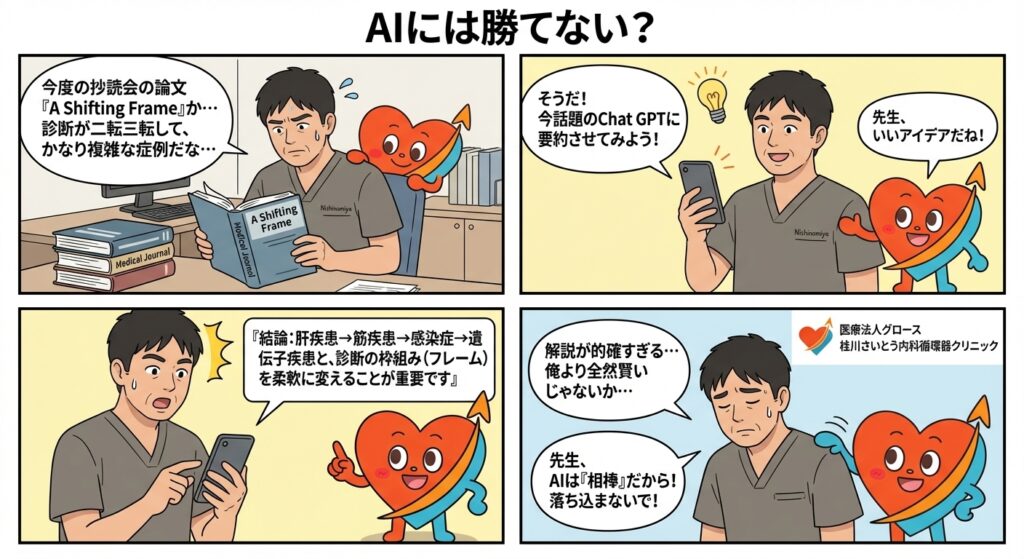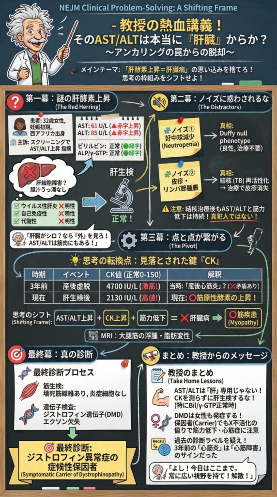 「ありがとう、はな子先生。典型的な『診断の枠組み(Frame)』がずれていく展開だね。肝臓だと思っていたら感染症(結核)が見つかり、それを治療してもデータが治らないから、ようやく筋肉にたどり着いた、という流れだ」