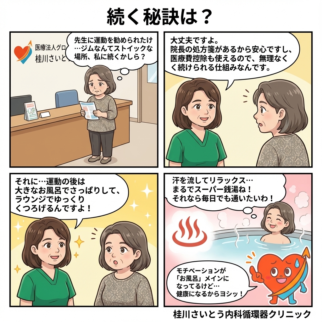 当院では、この「運動」を治療の一環として安全に取り入れていただくため、フィットネスクラブ「ピノス洛西口」と提携し、医療と連携した運動療法を実施しています 。