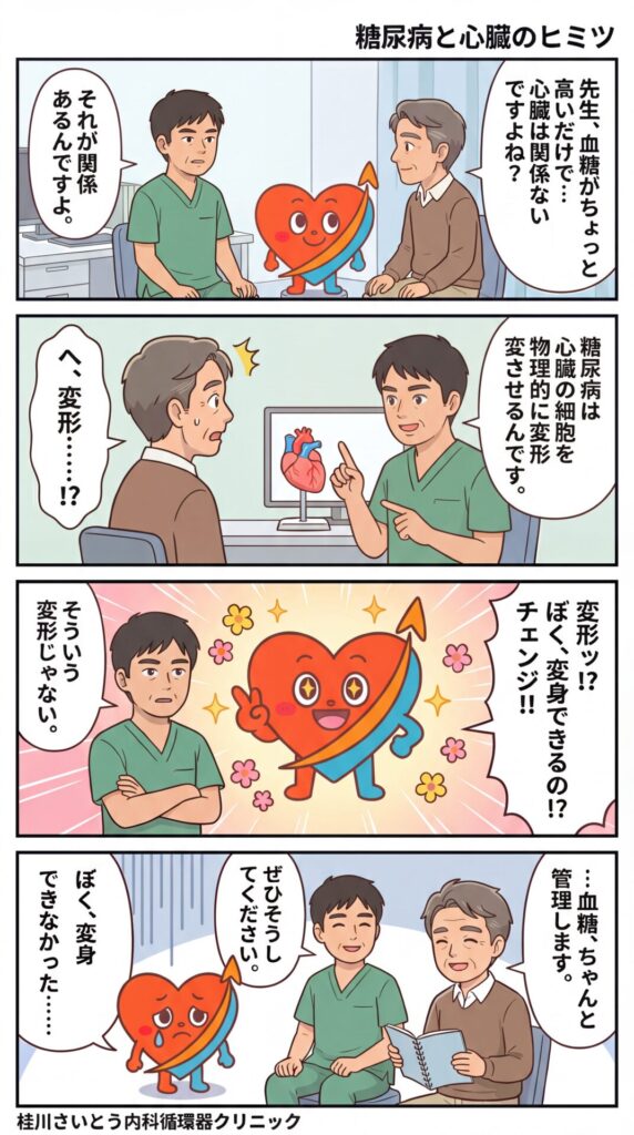 「糖尿病があると、なぜ心臓病になりやすいのですか?」——診察室でよく聞かれる質問です。これまでは「血糖が高いと血管が傷む」という説明が一般的でしたが、最新の研究が、そのメカニズムをより深いところで解き明かしました。糖尿病は心臓の細胞そのものを「物理的に変形」させていたのです。