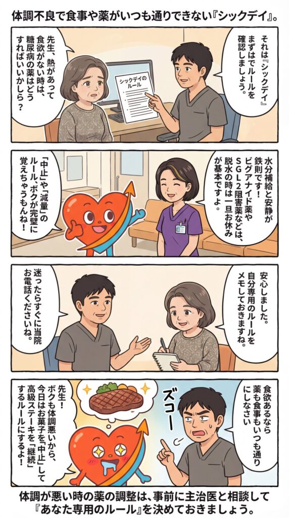 体調が悪い時は、たとえ食事ができていなくても、体の中ではストレスホルモンの影響で血糖値が上がりやすくなったり、逆に急降下したりと不安定になりがちです。いざという時に慌てないための「薬剤調整のルール」を確認しておきましょう。