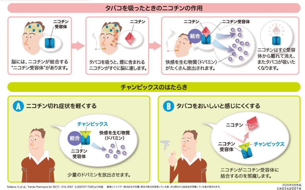 チャンピックスは、タバコに含まれるニコチンが脳に作用して生じる「おいしい」「落ち着く」といった感覚を抑えることで、喫煙時の満足感を減らし、禁煙中のイライラやストレスを和らげる飲み薬です。