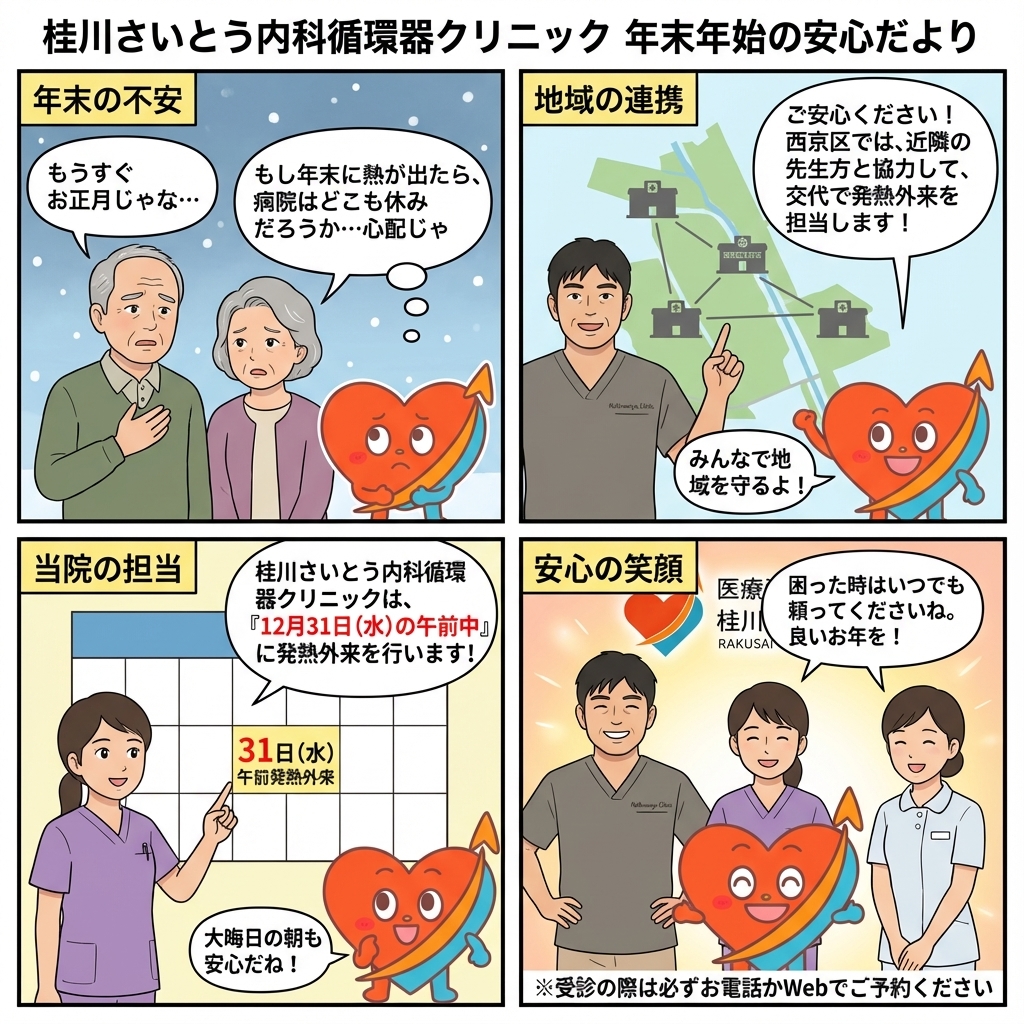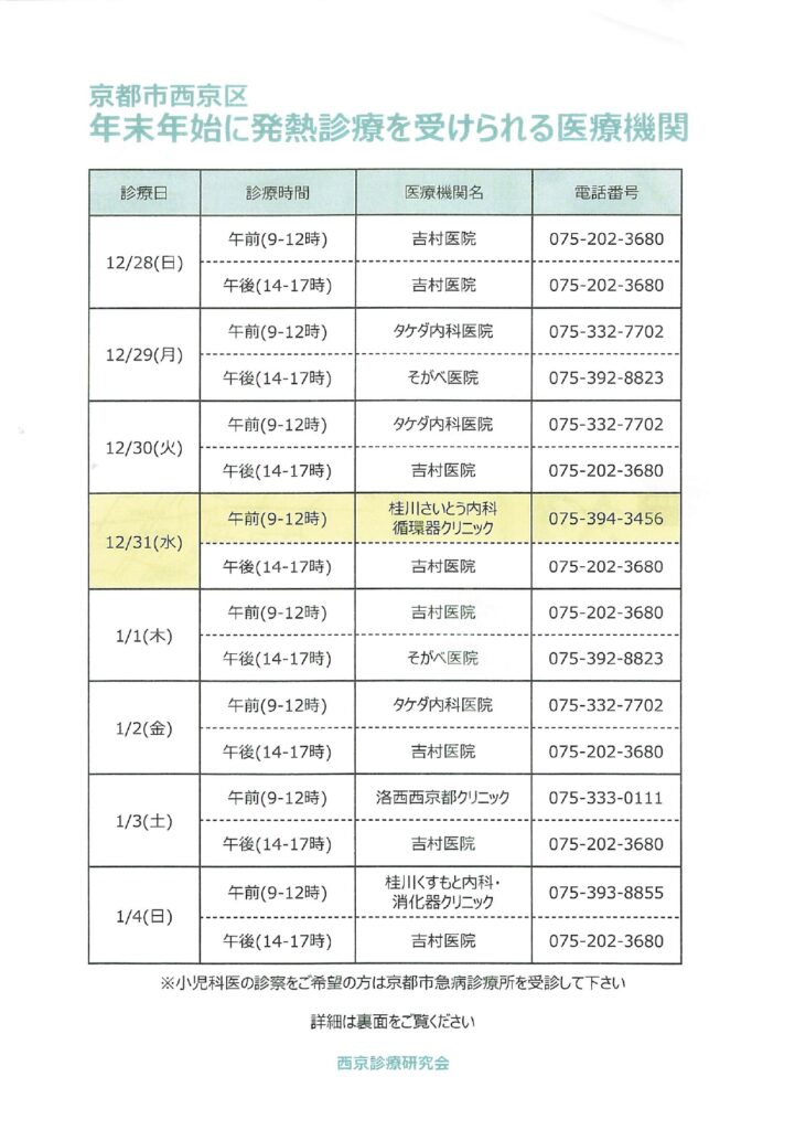 本年度は西京区内のクリニックで年末年始も発熱患者さんが受診いただけるように下記のクリニックで当番制として開院しております。当院は大晦日午前を発熱外来のため開院しております。